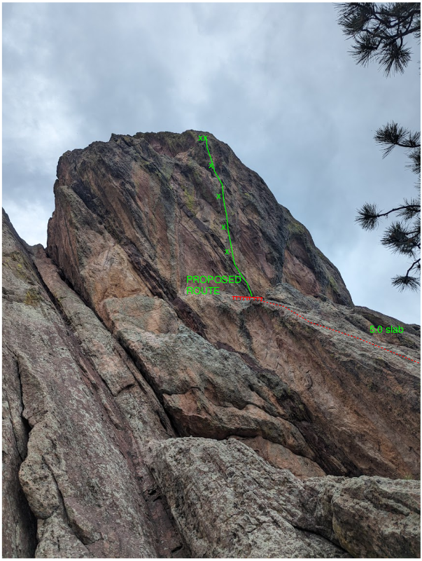 There are only 2 routes on the south face of Dinosaur rock. Pink Man’s Burden - 5.11d, 2-pitch bolted route South Ramps – 5.4 trad The proposed route starts about 50 ft right of Pink Man’s Burden, and about 100 ft left of south ramps.Existing Route Diagrams